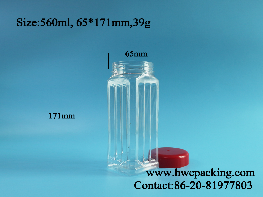 | Product's Name: | PET plastic square jar, plastic jar PET square, plastic cover PET jar, plastic cover PET square jar, dried vegetable 560ml PET square jar, cashews scented tea plastic cover PET square jar, bulk nuts PET square jar |